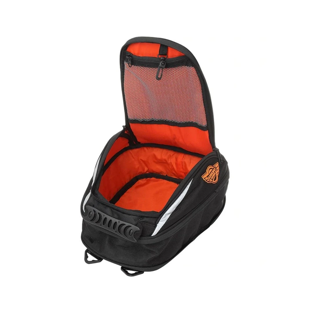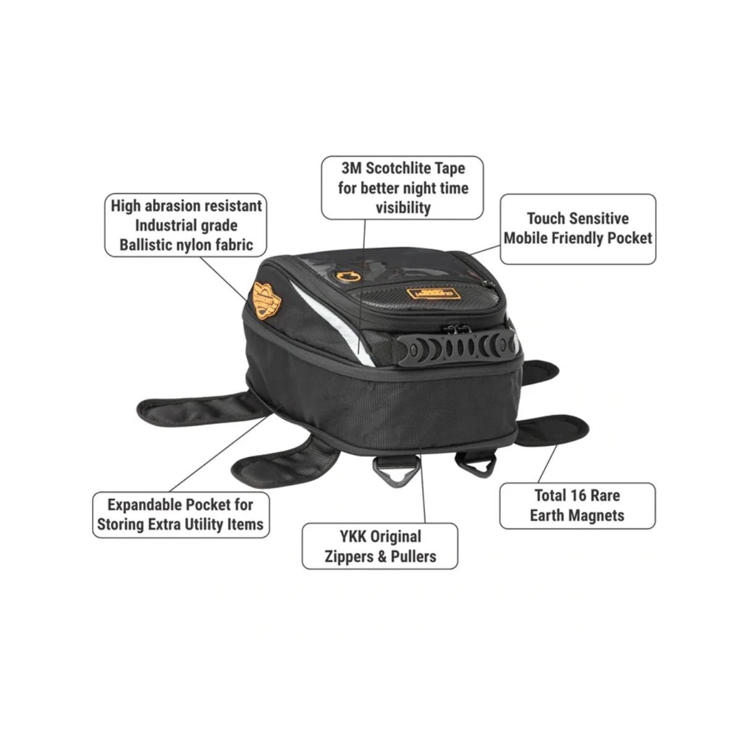 Jaws Mini Magnetic 18L tank bag from Guardian Gears, made from 1680D high abrasion resistant industrial grade ballistic nylon fabric, high tensile straps, heavy duty fittings, original YKK zippers and YKK pullers and 3M Scotchlite reflective tape, for all motorcycles with a metal tank.