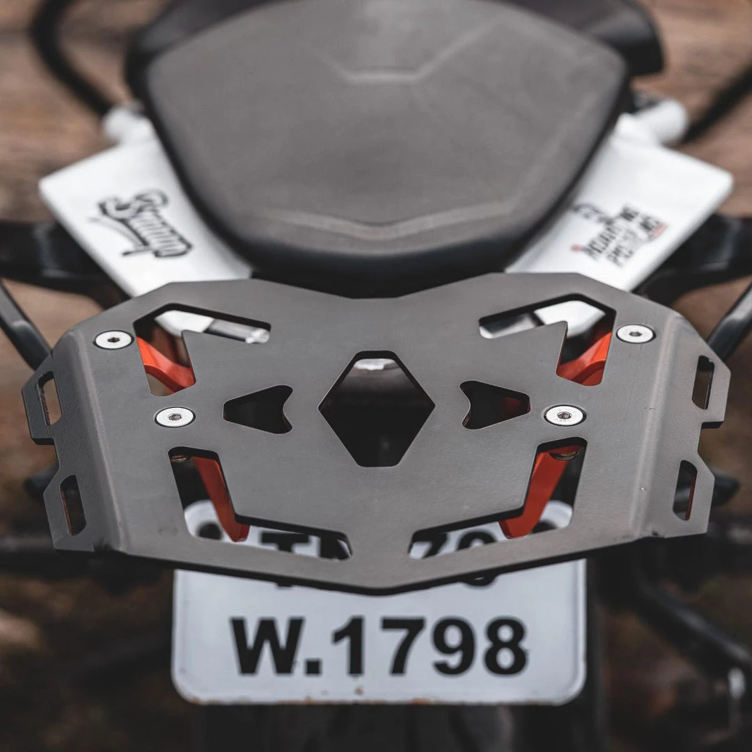 Motourenn brings you the best in class top rackย made for your KTM Duke 390/250/200/125. Designed keeping in mind not to disturb the street look, while making sure all your needs are met, be it mounting your tail bags, top box, or even groceries that your mom asked you to bring home. It is made from high precision laser cut using Cold Rolled Steel material and CNC bent.