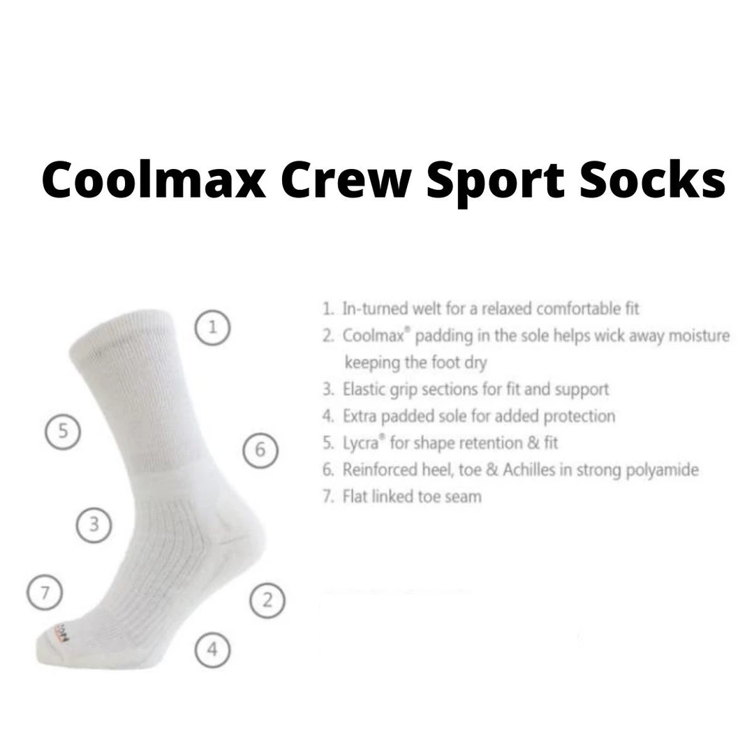 A fully cushioned sock with a double density sole and our signature knitted crew leg to offer superb non-restrictive comfort. The blend of fast wicking Coolmax and super soft combed cotton is ideal for keeping the feet in great shape. The socks have grip sections to prevent any unwanted movement within the shoe that can cause blisters and a flat linked toe seam for added comfort.