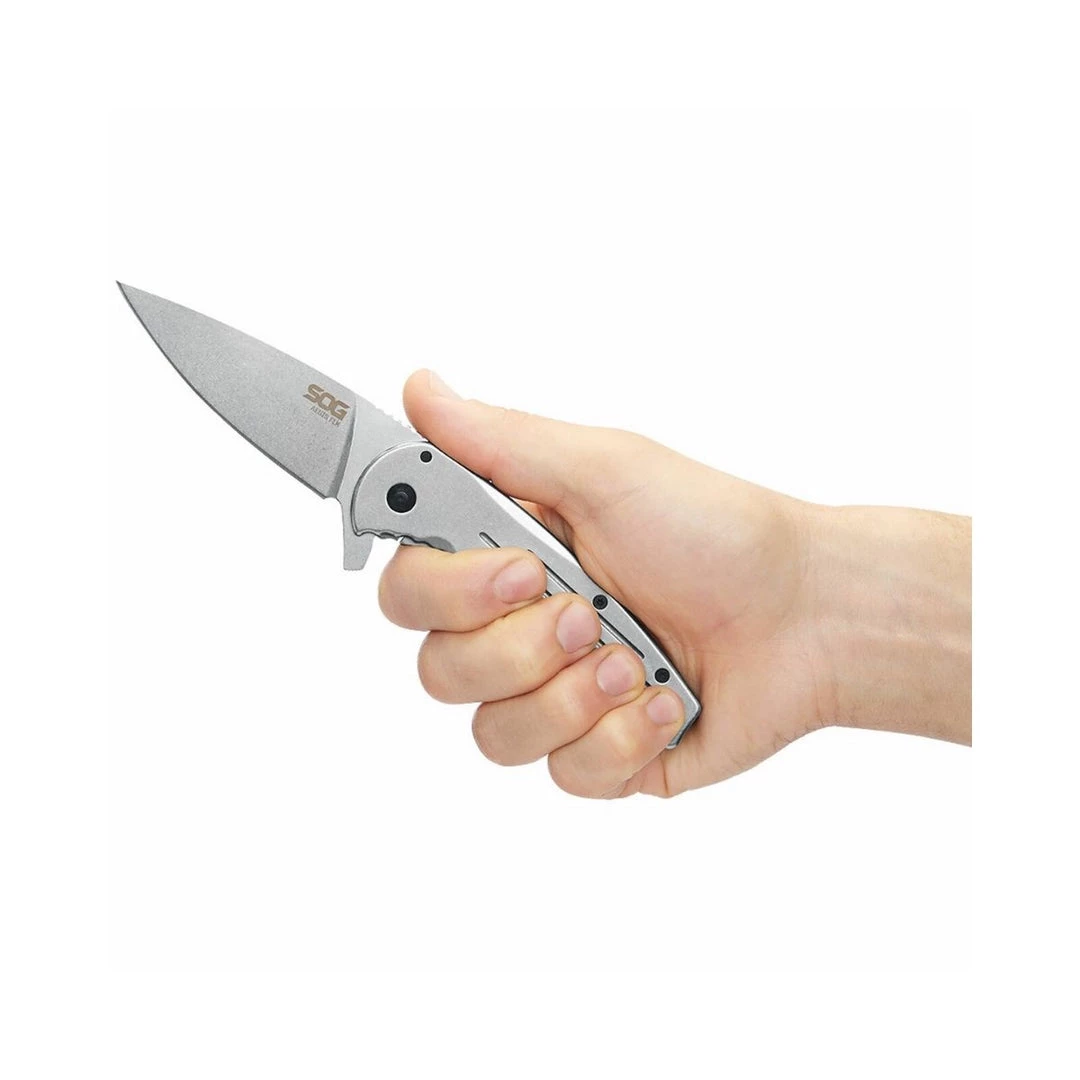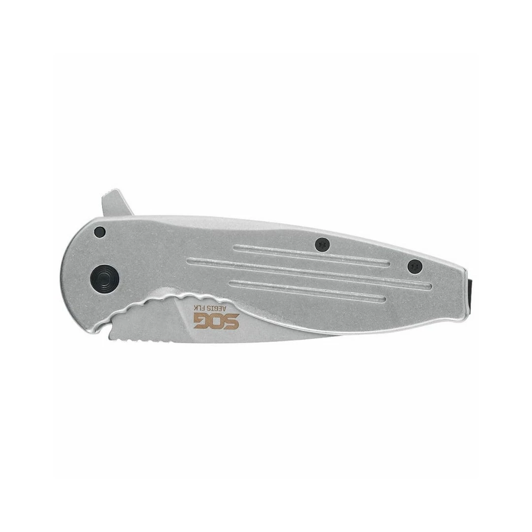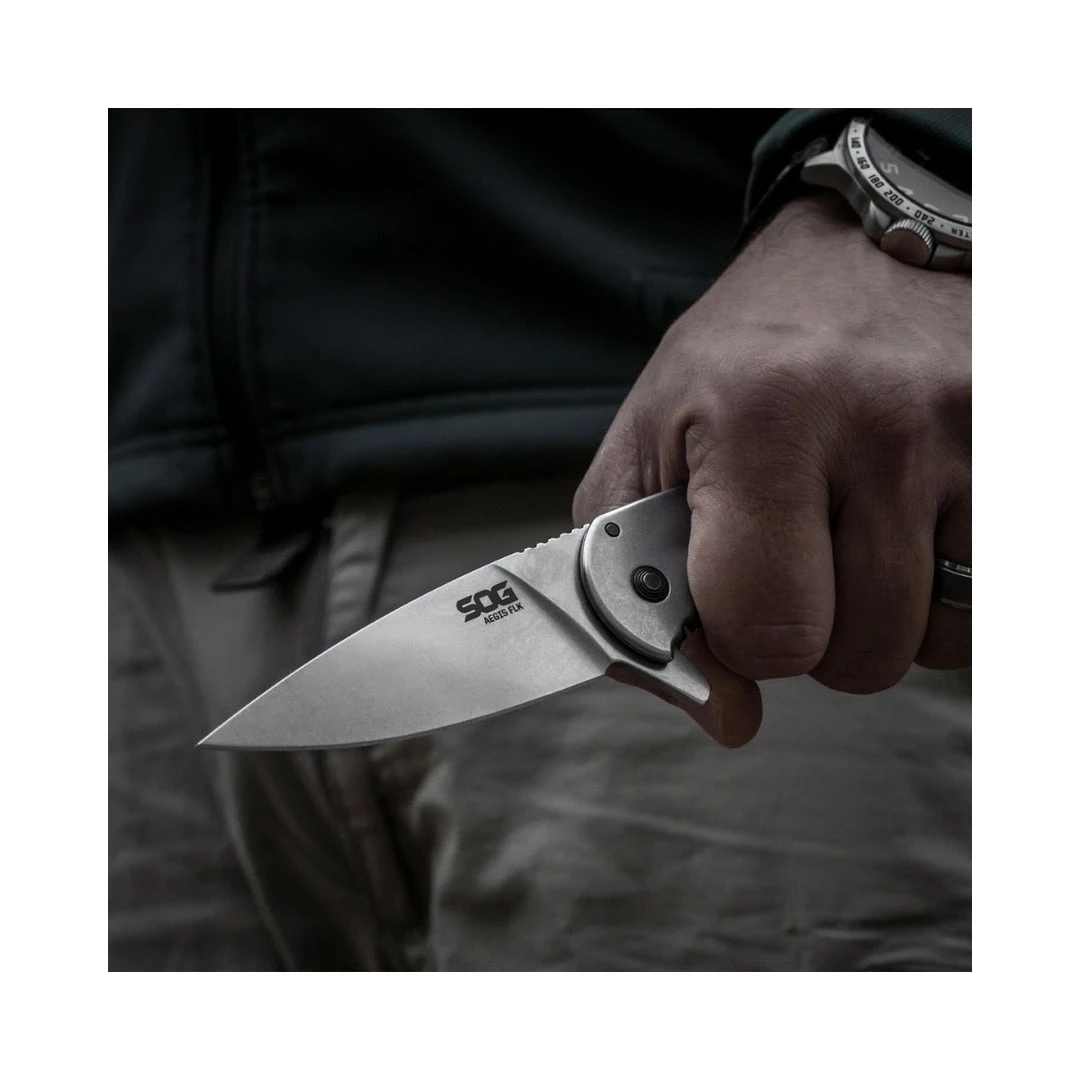 Sometimes a simple, honest knife with a SOG Sharp blade is just perfect. The Aegis FLK brings just that, a no-nonsense all-metal construction frame-lock featuring a kick deployment built on the proven SOG Aegis platform. Aegis FLK is the perfect entry-level knife built to last. Featuring durable, all-metal construction, deep-carry pocket clip, and a kick for smooth and fast opening. Item 14-41-02-42