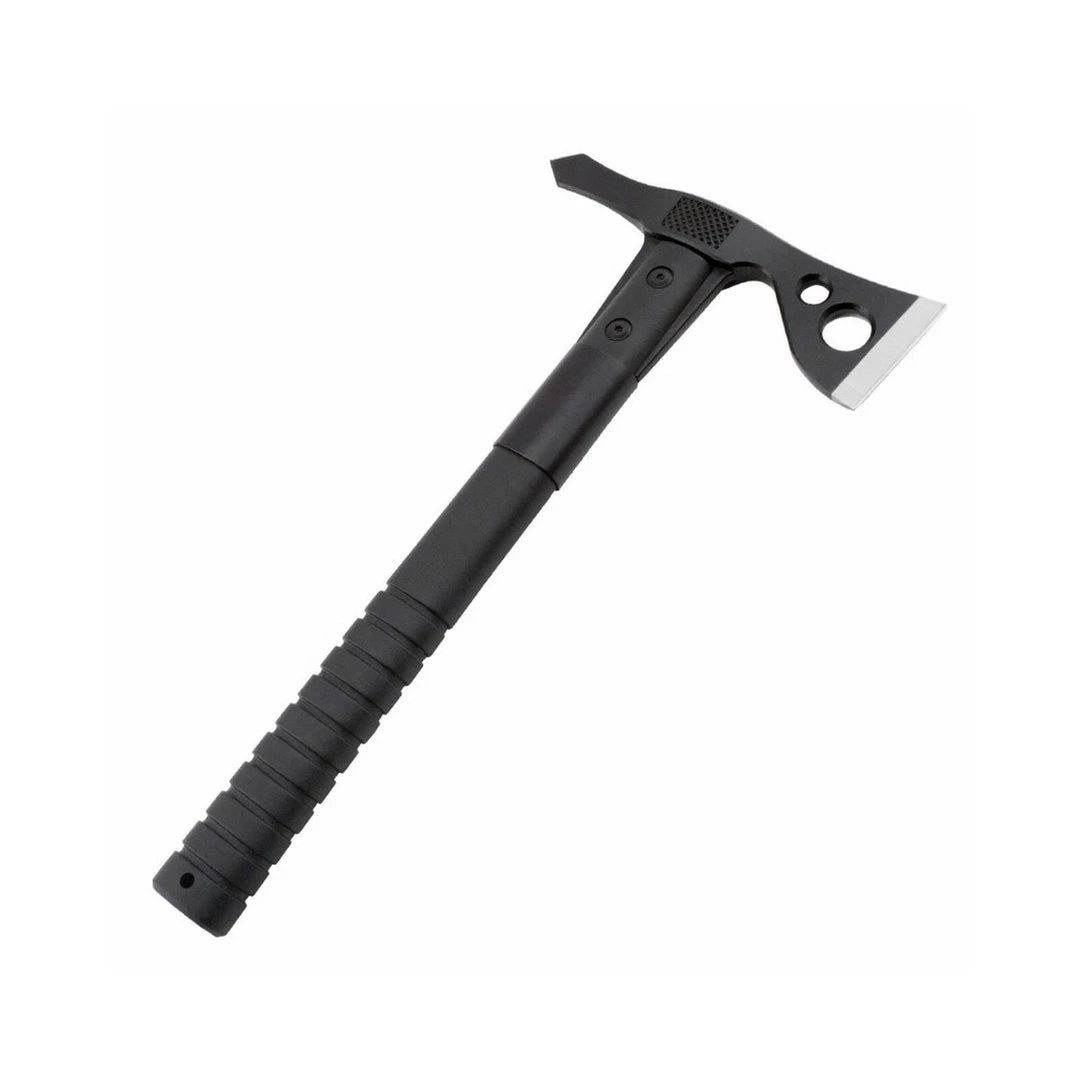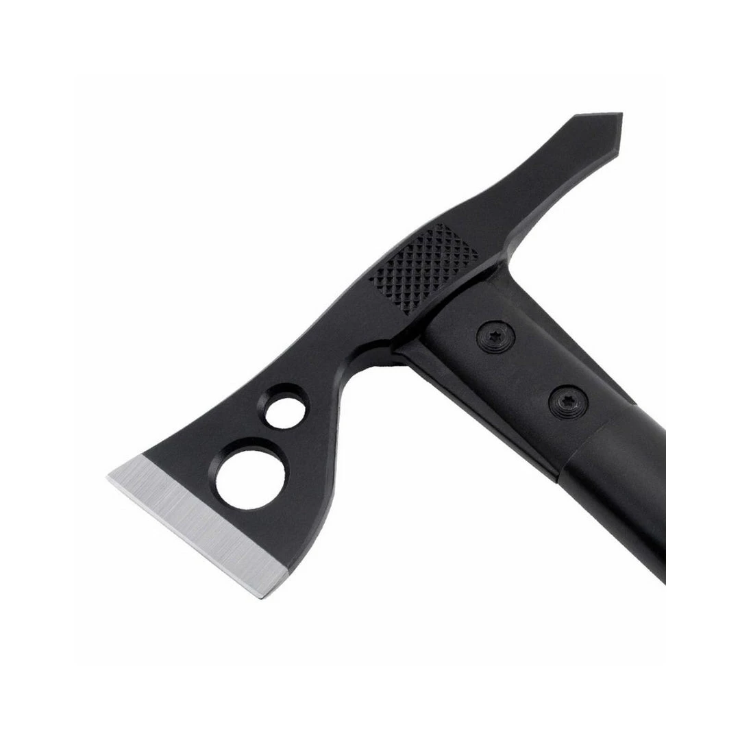 Chopping, breaking, cutting, hammering, piercing, digging, prying, pounding shaving, notching, opening and throwing are all capabilities well within the FastHawk’s reach. The 420 stainless steel head with a hard cased black coating is mounted to the ballistic polymer handle with heavy-duty bolts and a steel ferrule to insure the strongest integrity.
