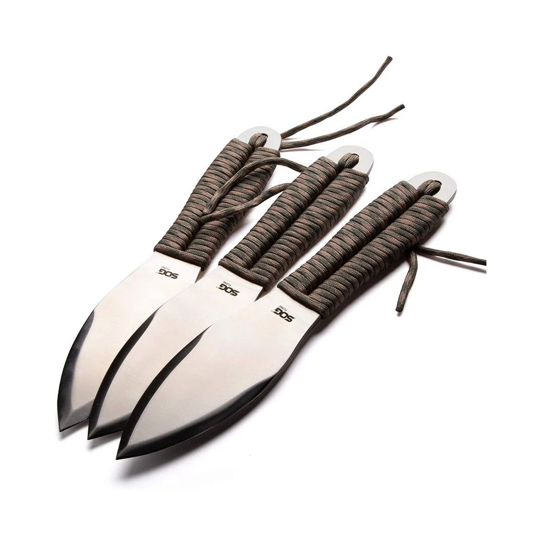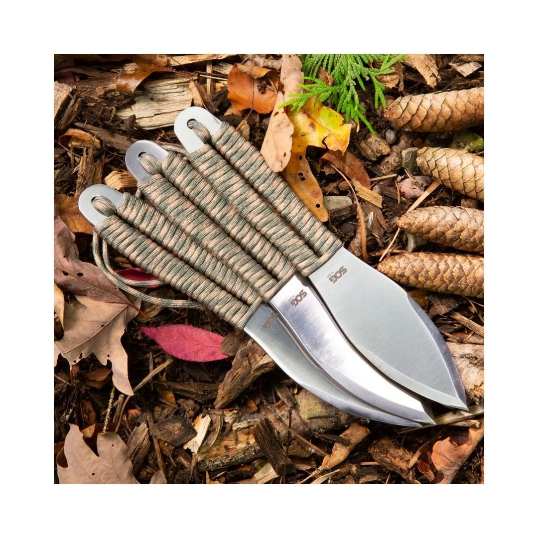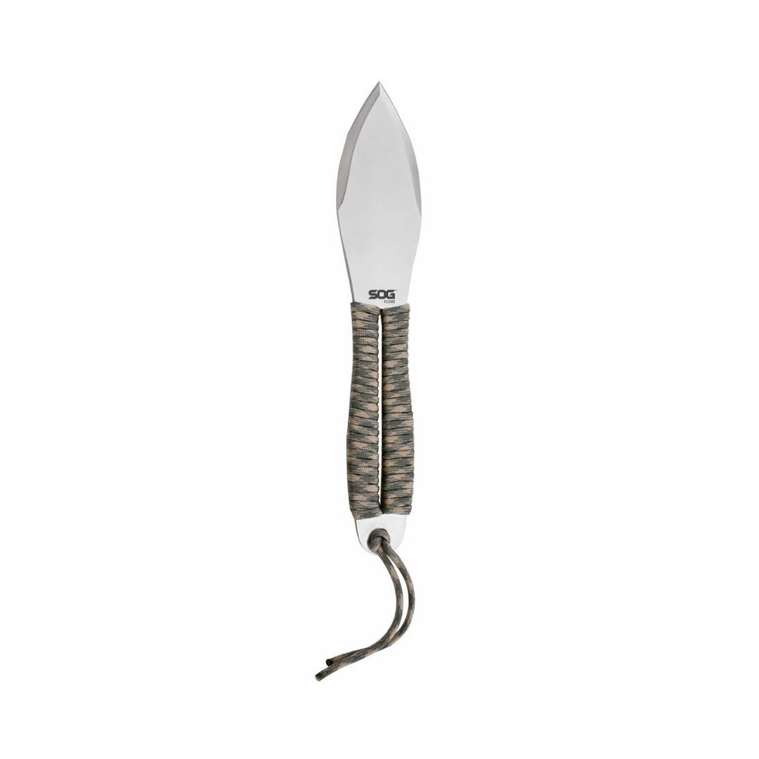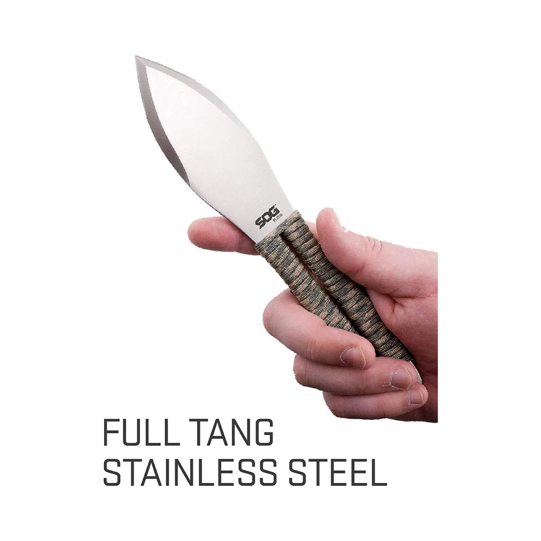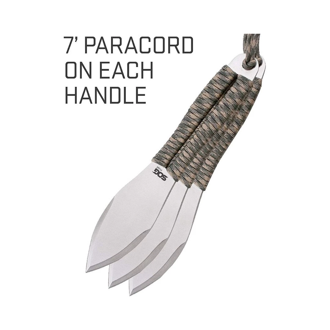 The Fling knives are styled after traditional throwing knives and perfect for backyard competitions. Each knife handle is wrapped with 7 feet of paracord, giving you a total of 21 feet, prefect for those unexpected situations. Also included with the three knives is a ballistic nylon carry sheath. See who can hit the bull’s eye first! Item FX41N-CP