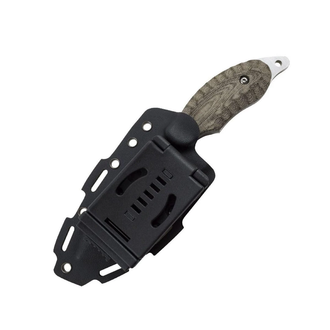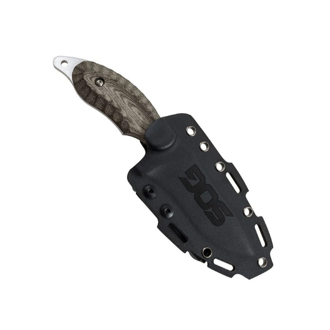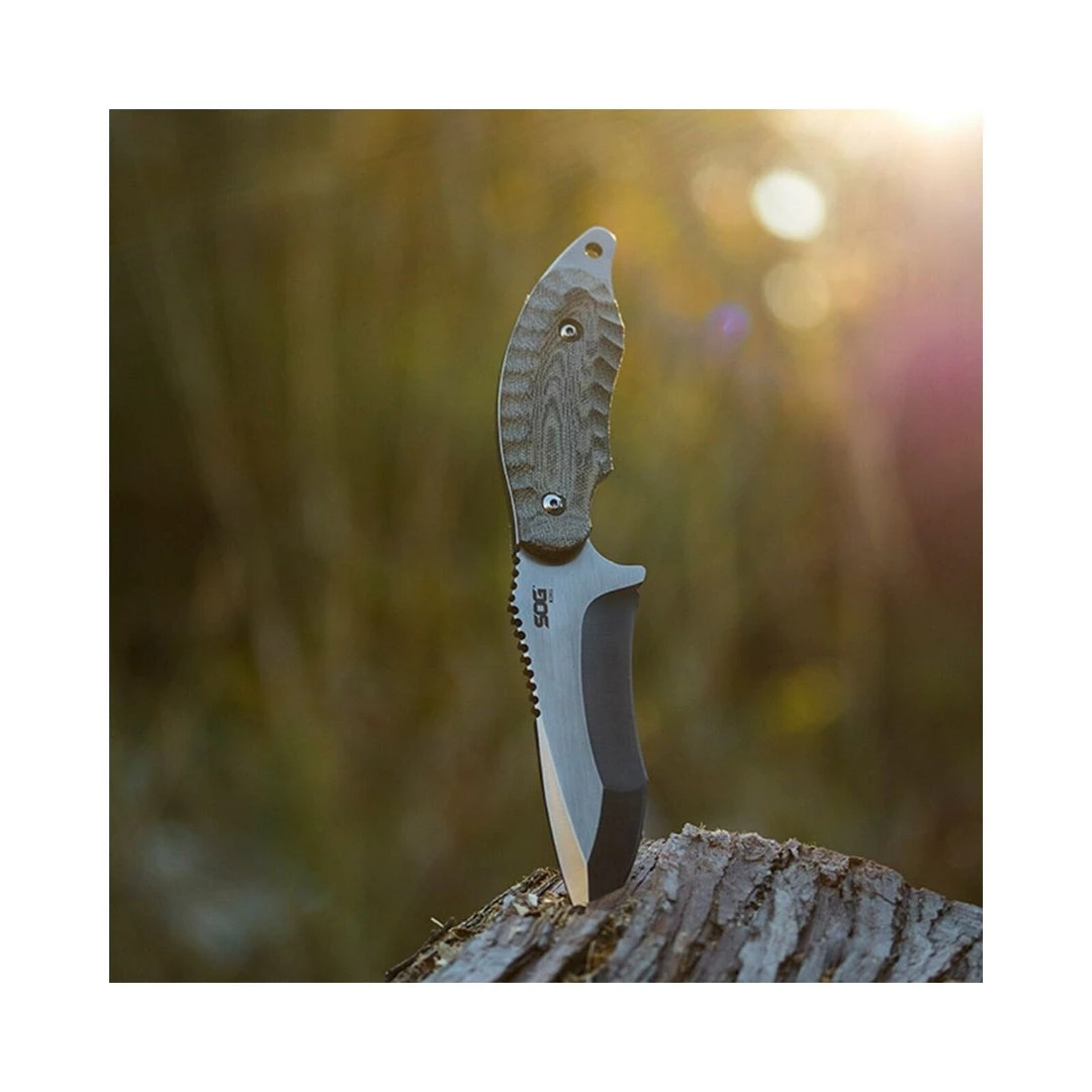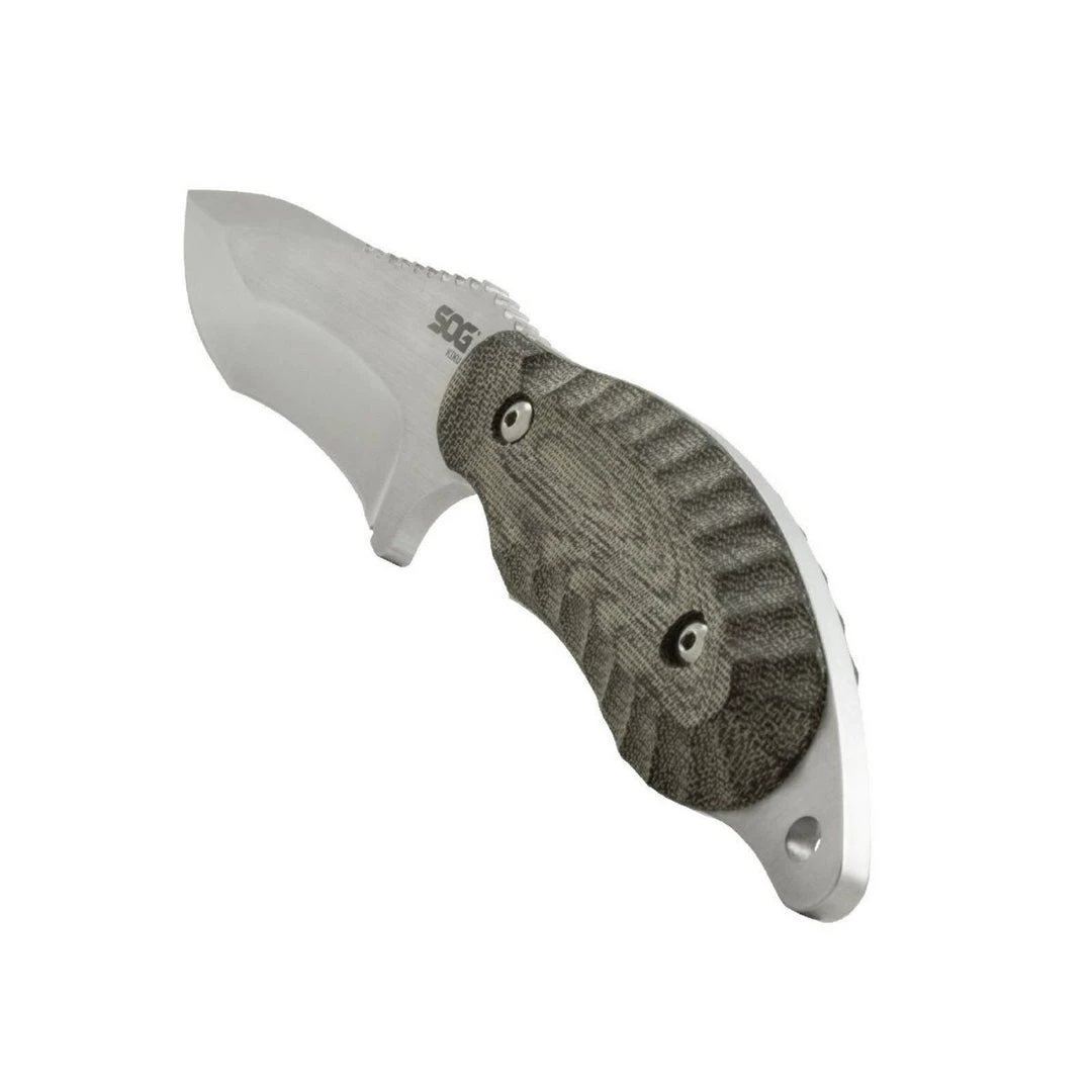 SOG partnered with Kiku Matsuda, one of the foremost tactical knife designers and blade grinders in Japan, to produce a line of knives. Matsuda’s decades of experience in blade grinding and making fixed blade knives has created one of the most unique, striking, and functional blades available. This Kiku fixed blade features Matsuda’s trademark and distinctive blade and handle grinds on a smaller 4-inch S35VN steel blade and linen Micarta handle. The full tang handle uses elegant linen Micarta slabs that are rugged, easy to clean, look better the more it is used, and offer superior grip in wet or dry conditions. It comes in a versatile Kydex sheath with an adjustable low-profile, locking mount. Part KU-2022
