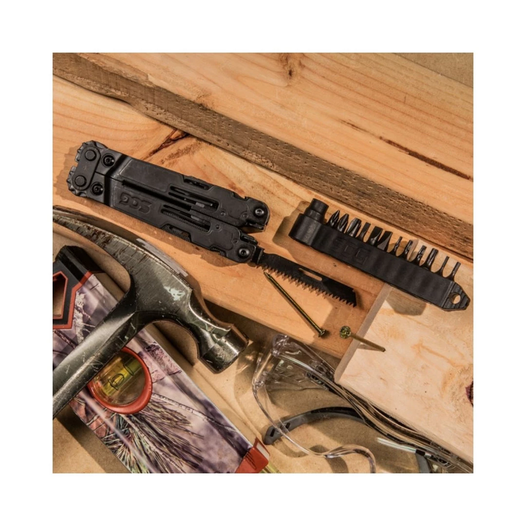 The PowerAccess Deluxe has the most tools of any SOG product to date (21). The Deluxe features SOG compound leverage for maximum gripping strength. Housed in a nylon sheath with 12-piece hex bit kit. Originally available in a satin finish, now available in stealthy black. Item PA2002-CP