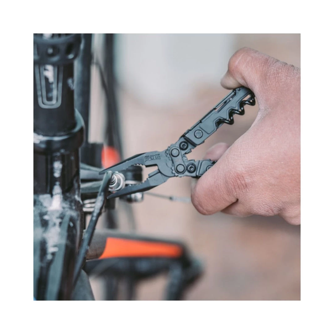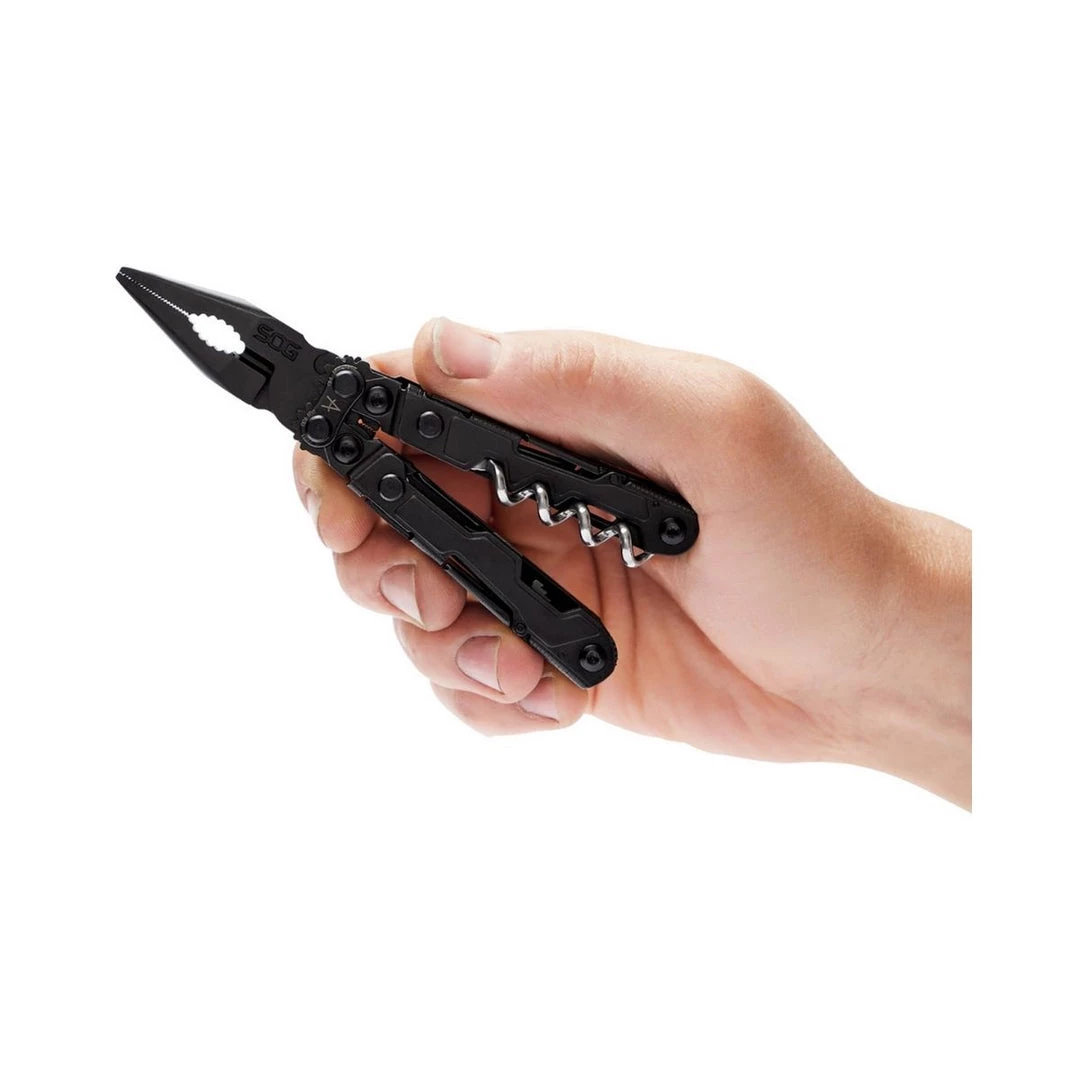 The PowerLitre is a mini-multi tool with that delivers full-sized utility, including the first SOG multi-tool to include a corkscrew. The Litre comes equipped with a magnetic hex bit holder, and of course it features SOG’s Compound Leverage that provides smooth open and close and increased gripping power, utilized both in the pliers and corkscrew. At only 5” long and a lightweight 4.6 ounces, the PowerLitre is a multi-tool that’s great in your pocket, your pack, on the tool bench, or around the house. Now available in a black coating. Item PL1002-CP