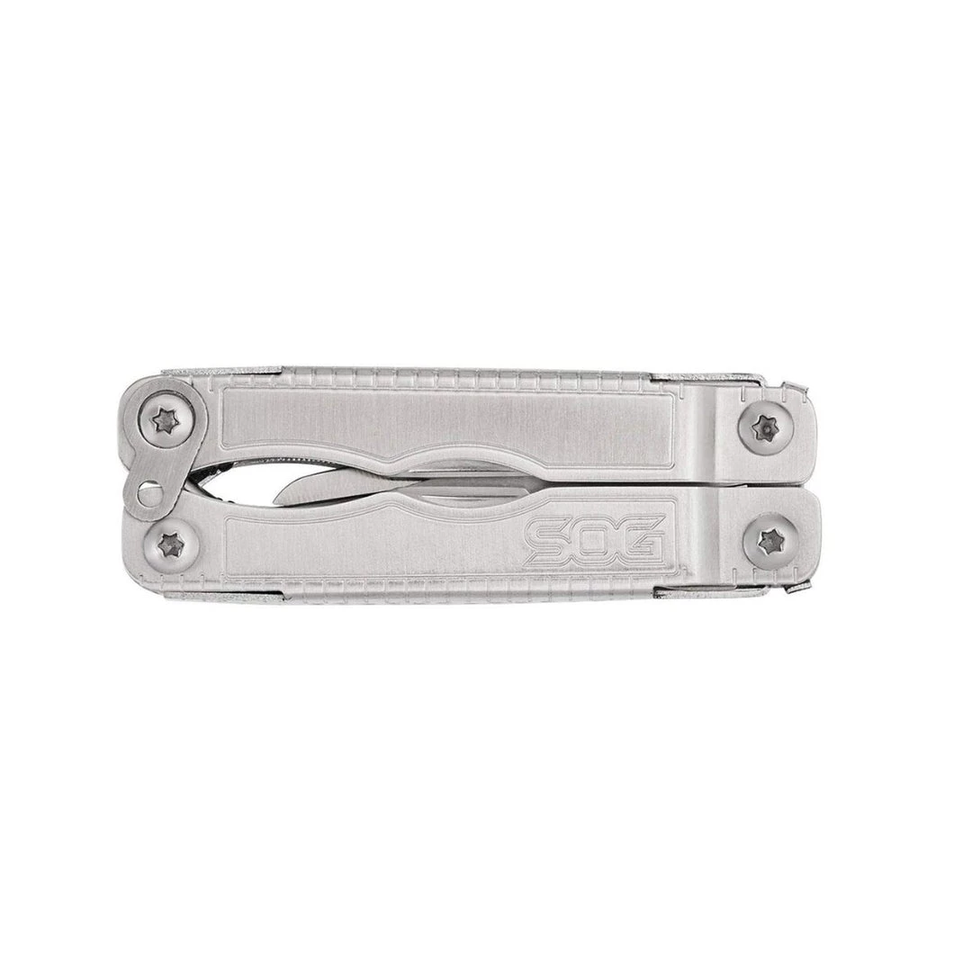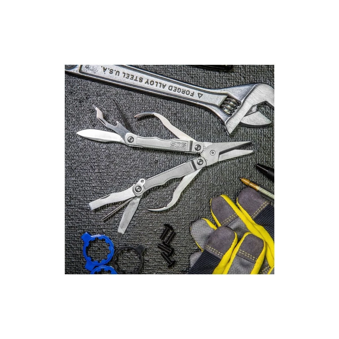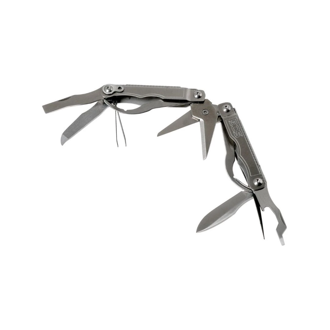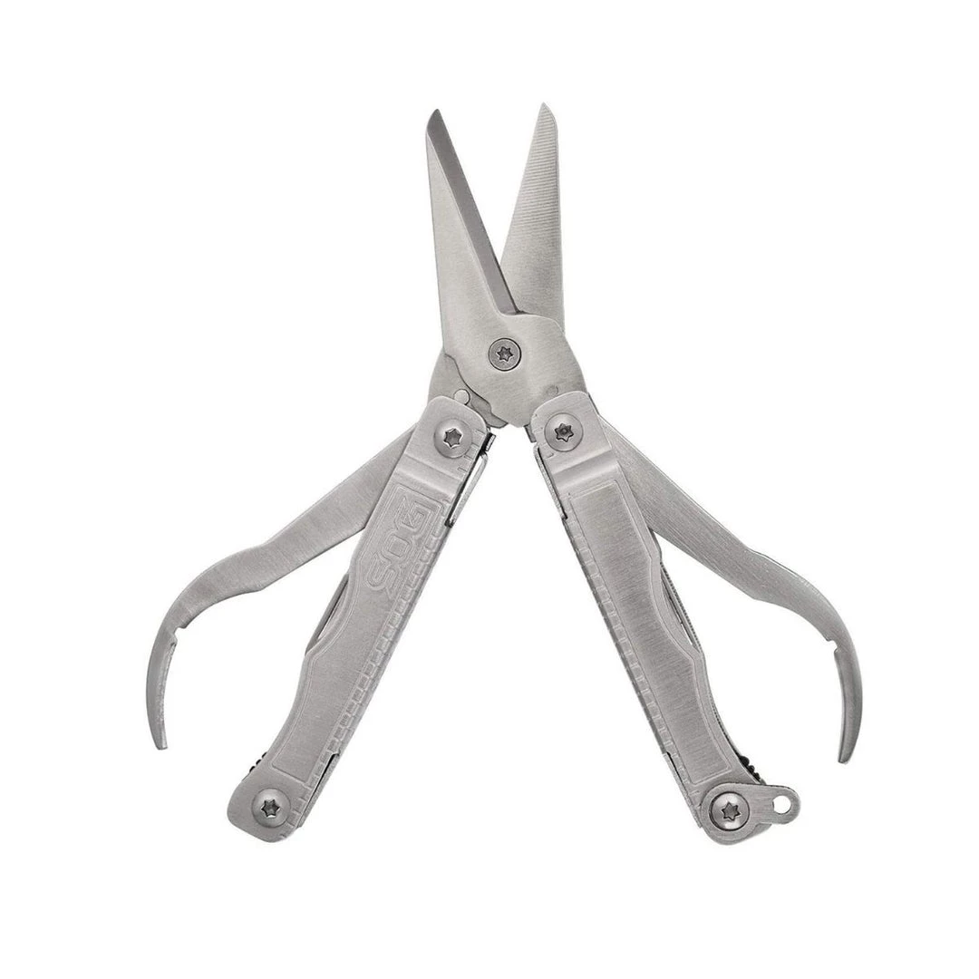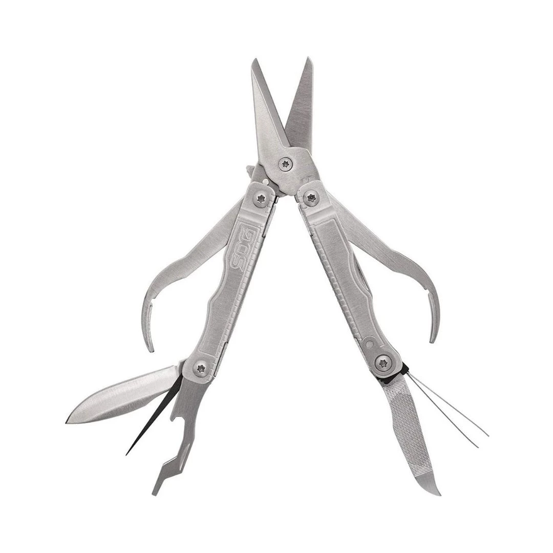 Compact and lightweight, has seven tools to handle most daily tasks including SOG-sharp scissors with finger loops. Includes scissors, toothpick, bottle opener, knife blade, fingernail file, flathead screwdriver, and tweezers.
