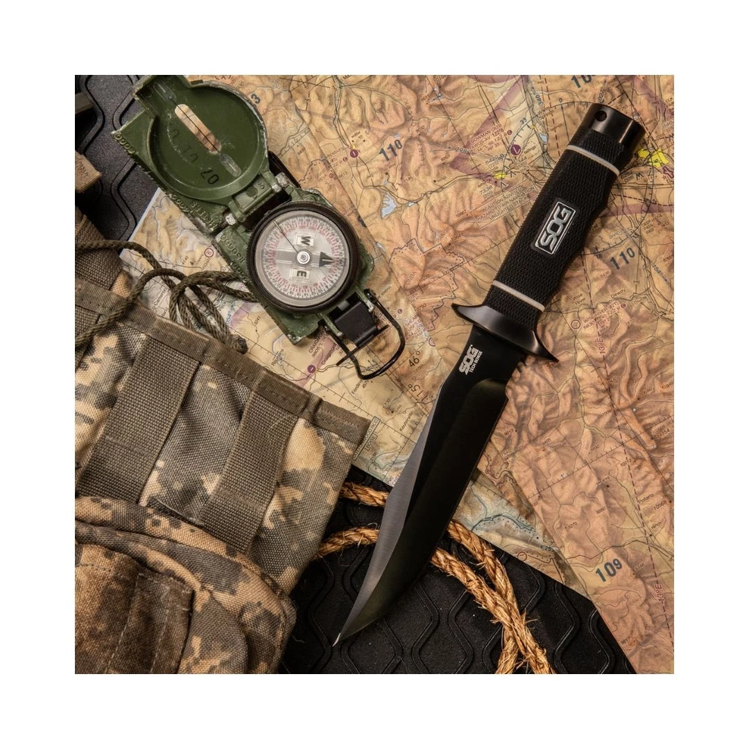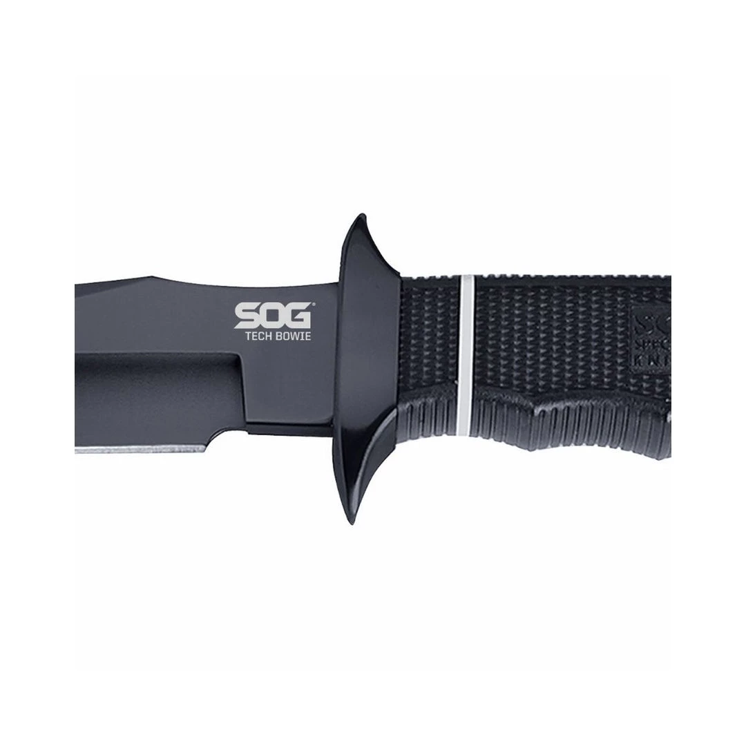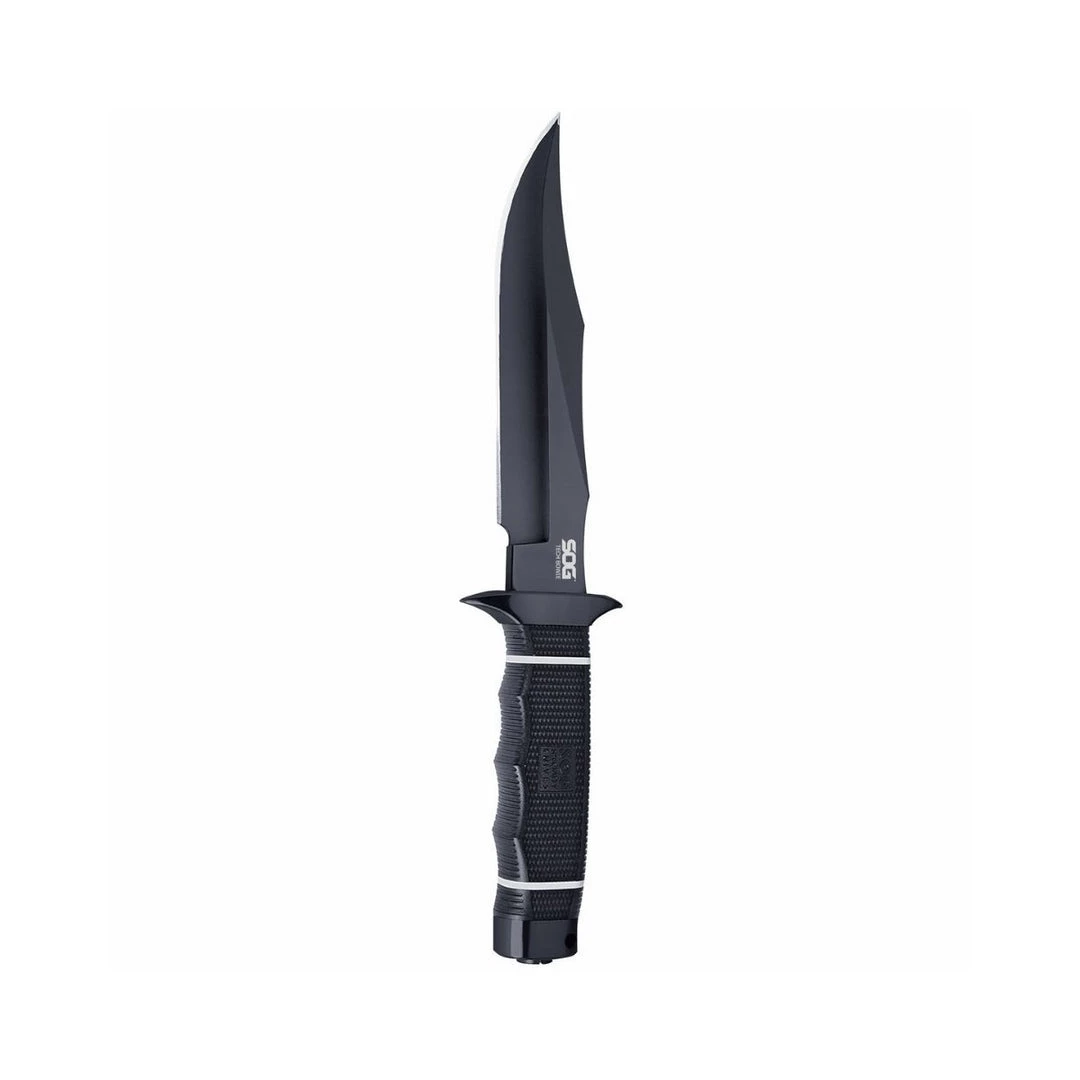 Large format fixed blade in the family of SOG’s original Bowie: Features 6.4-inch full tang blade made of quality AUS-8 steel, a textured rubber handle with a stainless steel crossguard and pommel.