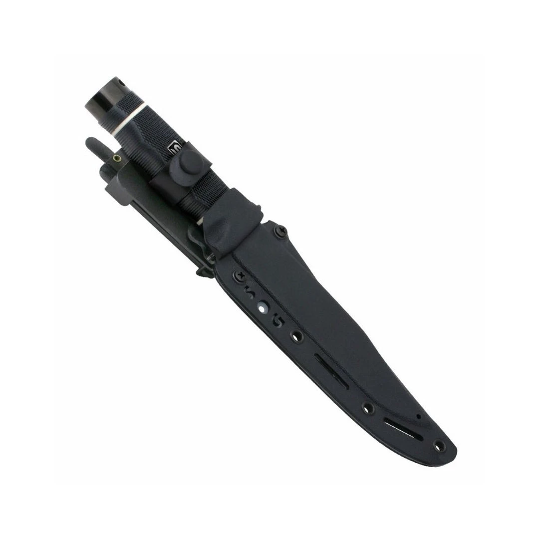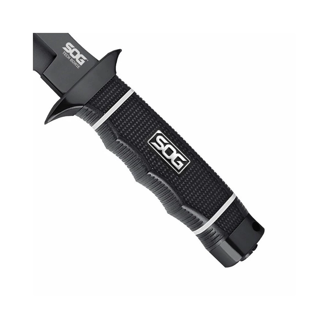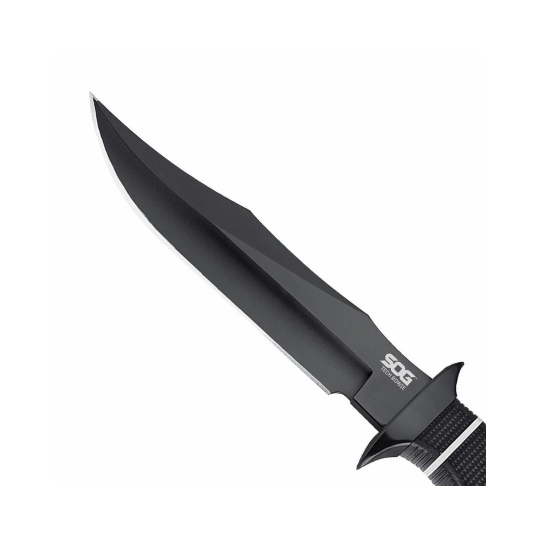 For those who are looking for the style of the SOG Bowie with a modern treatment, look no further than the Tech Bowie. The Tech Bowie has morphed into a top-notch work knife with the use of modern technology and materials. All the metal parts including the blade, crossguard and pommel are hardcased black TiNi coated. The tactile Kraton rubble handle gives a contemporary touch to the traditional leather washers. The thick (0.24″) AUS-8 blade is topped off the same blade grind as the SOG Bowie. The sculpted crossguard, deep hollow grinds and precision detailing, and faceted tip are unmistakable signatures of SOG. Part S10B-K